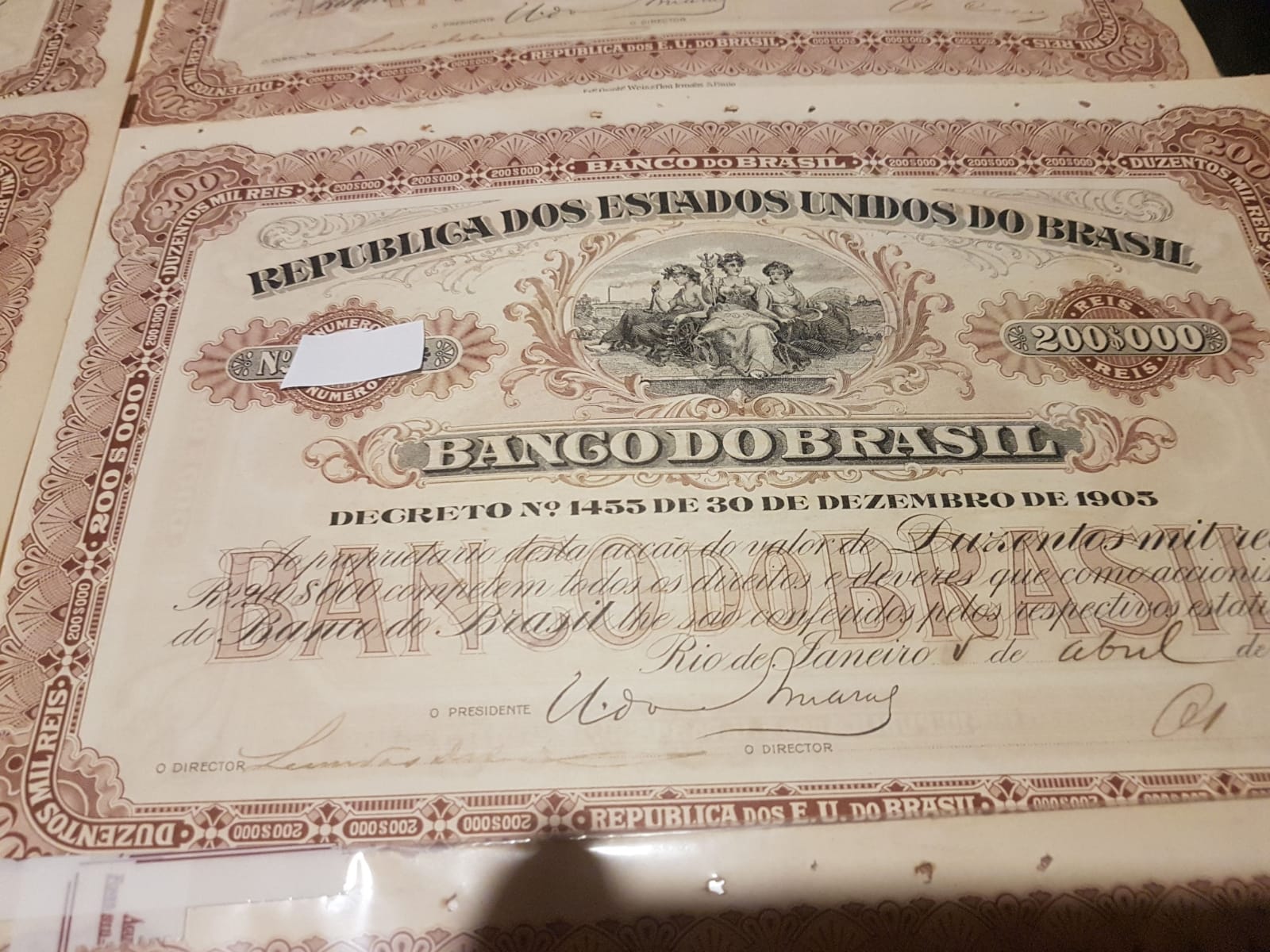 AÇÕES 200$000 RÉIS BANCO DO BRASIL 1910 DECRETO 1455 DE 1905 APENAS R$ 10 MIL REAIS LAUDADA E DE ORIGEM